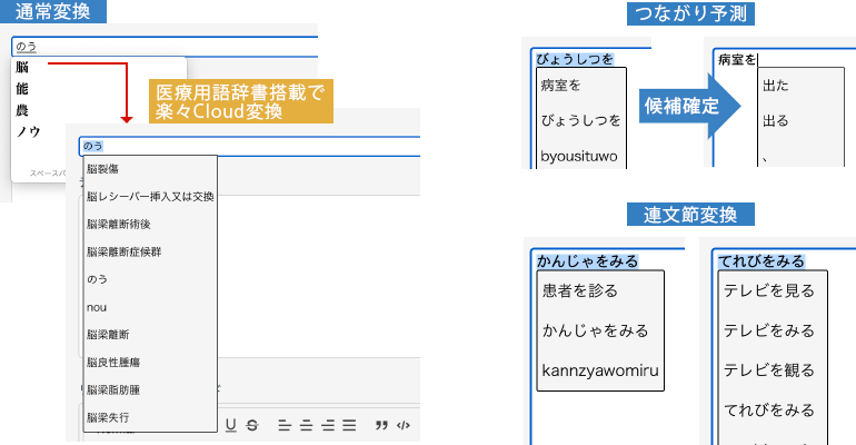 Dictionaries of specialist terminology are included, reducing the work needed to enter characters. Character input is also assisted by character conversion functions with association prediction and conjunctive phrase conversion.