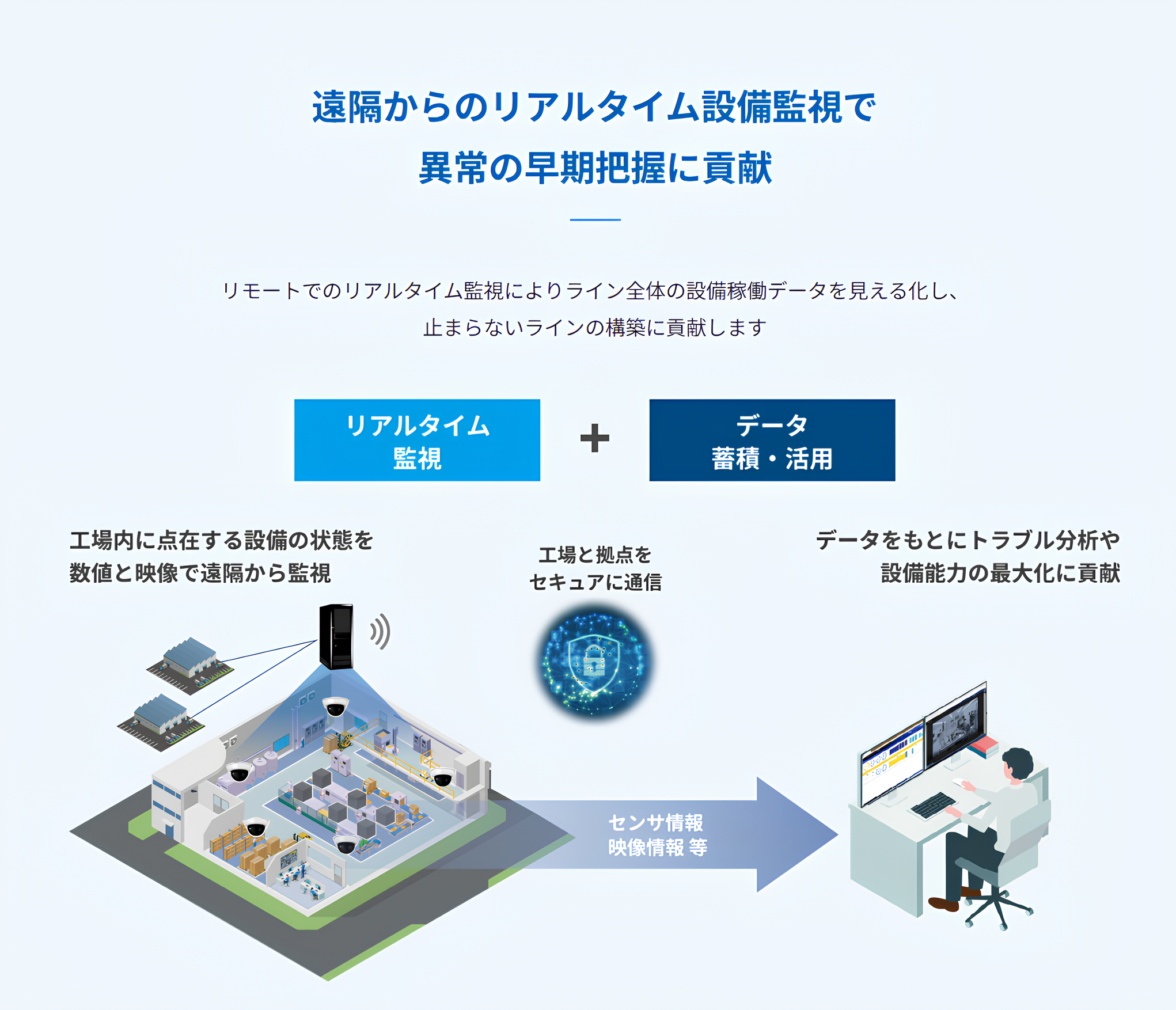 遠隔から複数の設備の稼働状況を詳細な数値と映像でリアルタイムに把握できます。異常が発生した場合は即座にアラートが発せられ、迅速な対応が可能です。これにより、設備の停止時間を減少させ、常に安定した運用が可能となります。