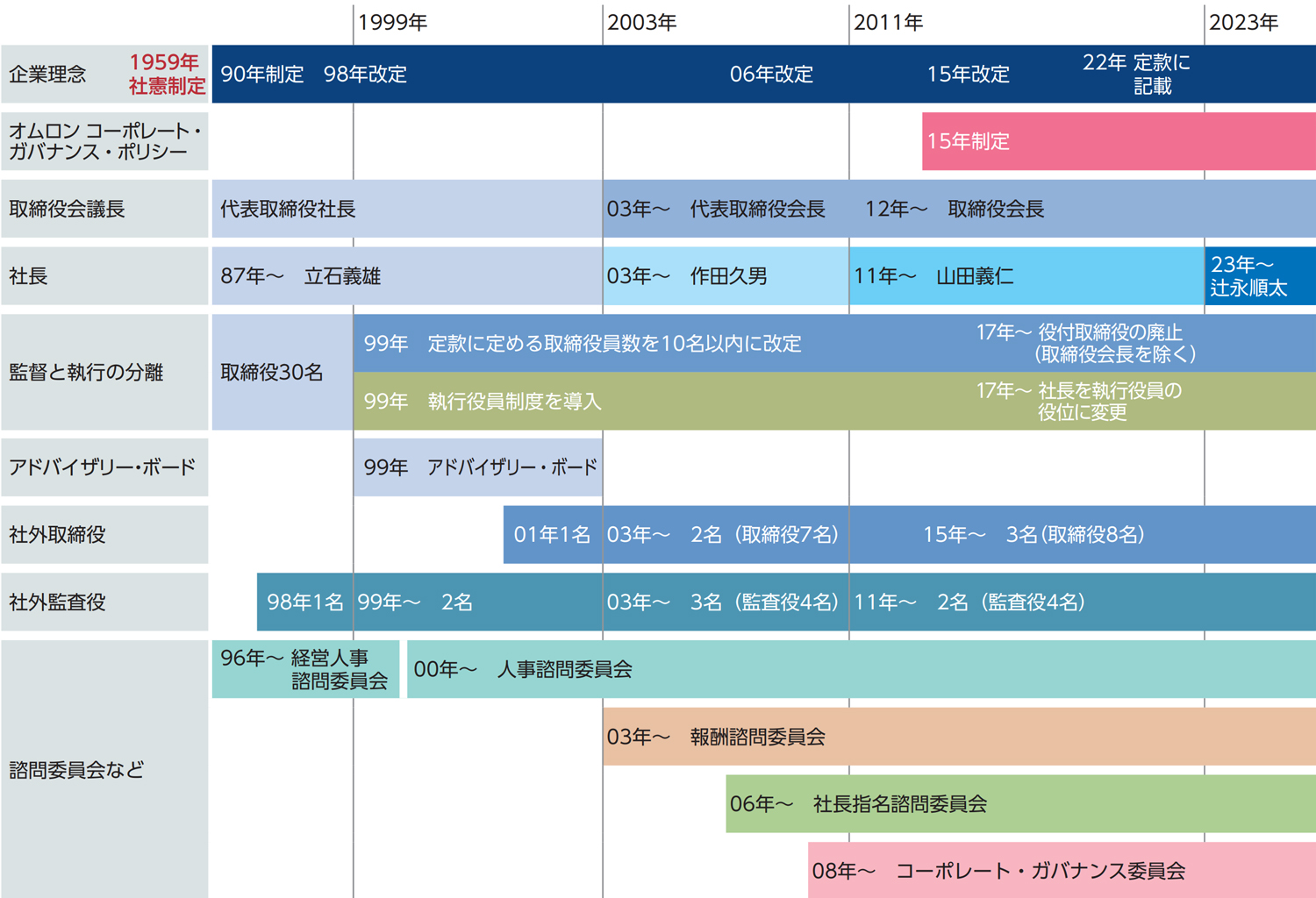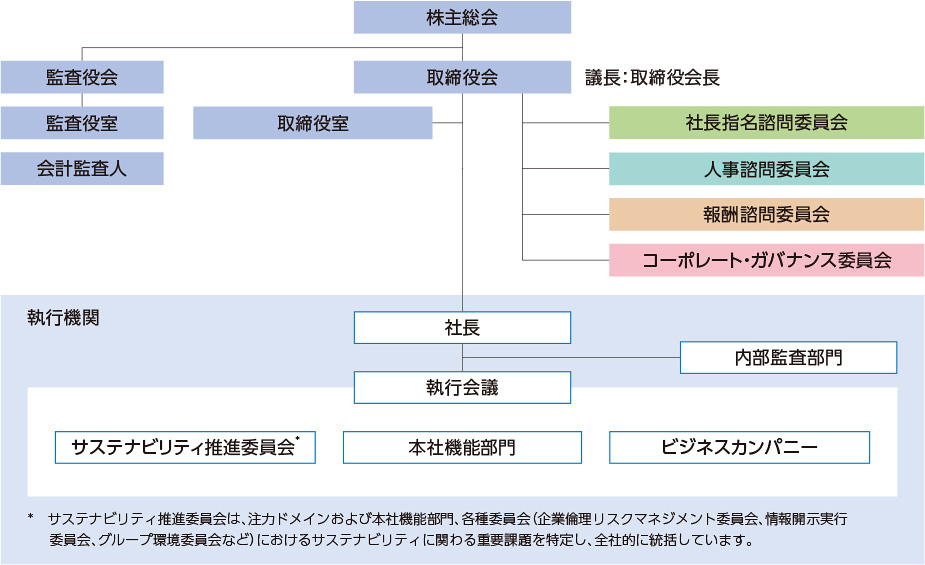 さらに、取締役会の監督機能を強化するため、取締役会の傘下に任意の4つの委員会を設置しております。社長指名諮問委員会、人事諮問委員会、報酬諮問委員会は、いずれの委員会も社長CEOは属さず、委員長は独立社外取締役とし、委員の過半数を独立社外取締役としております。特に、社長指名諮問委員会は取締役会の監督機能上の最重要事項である社長の選任等に特化しております。加えてコーポレート・ガバナンスの向上を目的としたコーポレート・ガバナンス委員会は、委員長は独立社外取締役とし、委員を独立社外取締役および独立社外監査役ならびに非業務執行社内取締役としております。これらの当社独自の工夫により、経営陣の意思決定に対する透明性と客観性を高める仕組みを構築し機能させております。