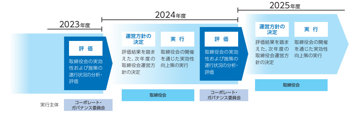 取締役会は、コーポレート・ガバナンス委員会による評価結果および事業環境等を踏まえた上で、次年度の取締役会運営方針および注力する重点テーマについて決定し、その運営方針に基づき年間計画を策定し運営しています。