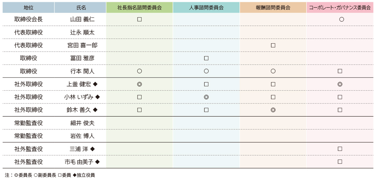 委員長は独立社外取締役とし、委員を独立社外取締役および独立社外監査役ならびに非業務執行社内取締役としております。