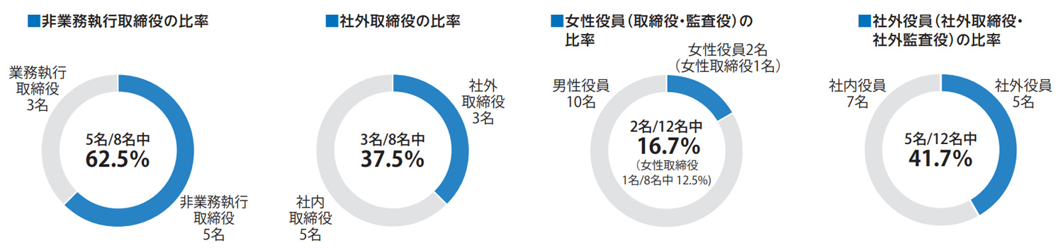 当社は、取締役会の監督機能を強化するために、監督と執行を分離し、取締役の過半数を業務執行を行わない取締役によって構成しています。また、取締役会における社外取締役の割合を3分の1以上としています。社外取締役および社外監査役については、独立性の確保の観点から、当社の「社外役員の独立性要件」を基準に選任します。そのうえで、取締役会の構成員である取締役および監査役について、経営ビジョンを実現するために必要な経験・専門知識・知見を備える多様な人財で構成するとともに、ジェンダー、国籍、国際性、年代等の区別なく多様性を確保します。