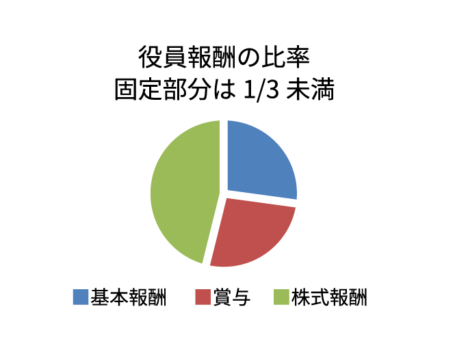 外部専門機関の協力を得て国内外の報酬制度の最新動向を調査し、報酬制度の課題を洗い出して、議論を重ねてきました。今回の改定は、オムロンが構造改革を経て成長フェーズへ移行する「過渡期」であることを踏まえ、次の2点を重視しました。1つ目は、変化の激しい外部環境に迅速かつ柔軟に対応できる報酬制度とすること。2つ目は、SF2030ビジョンの実現に向け、経営陣の主体的な価値創出を促すインセンティブとすること。具体的には、短期業績連動報酬(賞与)について、金額算定基準の決定方法を、従来の株主総会による決議から、報酬諮問委員会の答申を経て取締役会で決定する方式へと見直しました。これにより、業績との連動性を一層高めるとともに、外部環境への柔軟な対応が可能となります。次に、中長期業績連動報酬(株式報酬)については、(1)評価期間を4年から2年に短縮し、(2)社外取締役にも新たに株式報酬を導入しました。評価期間の短縮は、構造改革下で迅速な意思決定と早期の成果創出が求められる現在のフェーズに対応するものです。2年ごとの評価に基づき算定し、株式交付の時期は業務連動部分も含めて退任時に支給することで、短期的成果への過度な偏重を防ぎ、役員在任期間を通じて企業価値向上への意識を高める設計としました。また、社外取締役への株式報酬導入は、社外取締役が株主と同じ目線で企業価値を捉え、中長期的な企業価値向上に対する意識を一層高めることを目的としています。業績に直接連動しない株式報酬のみとすることで、短期的な業績に左右されず、中長期的な視点からの経営監督と企業価値向上への関与を促します。今回の改定は、ガバナンス強化に加え、ステークホルダーの皆様との一体感の醸成、優秀な社外人財の確保という観点からも、大きな意義があると考えています。これらの改定に加え、役位・役割ごとに設計された報酬の構成比率にも特徴が表れています。たとえば社長CEOの場合、今回の改定により、基本報酬を「1」とすると、株式報酬は「1.7」の水準で設定されており、総報酬において株式報酬の比率が約半分を占めています。これは、「企業価値の向上がCEOの最大の使命である」という考えを明確に反映したものです。結果として、以下の円グラフに示すとおり、固定報酬の比率は全体の3分の1未満に抑えられ、業績や株主価値と連動する変動報酬の比率が高い、戦略的な報酬設計となっています。