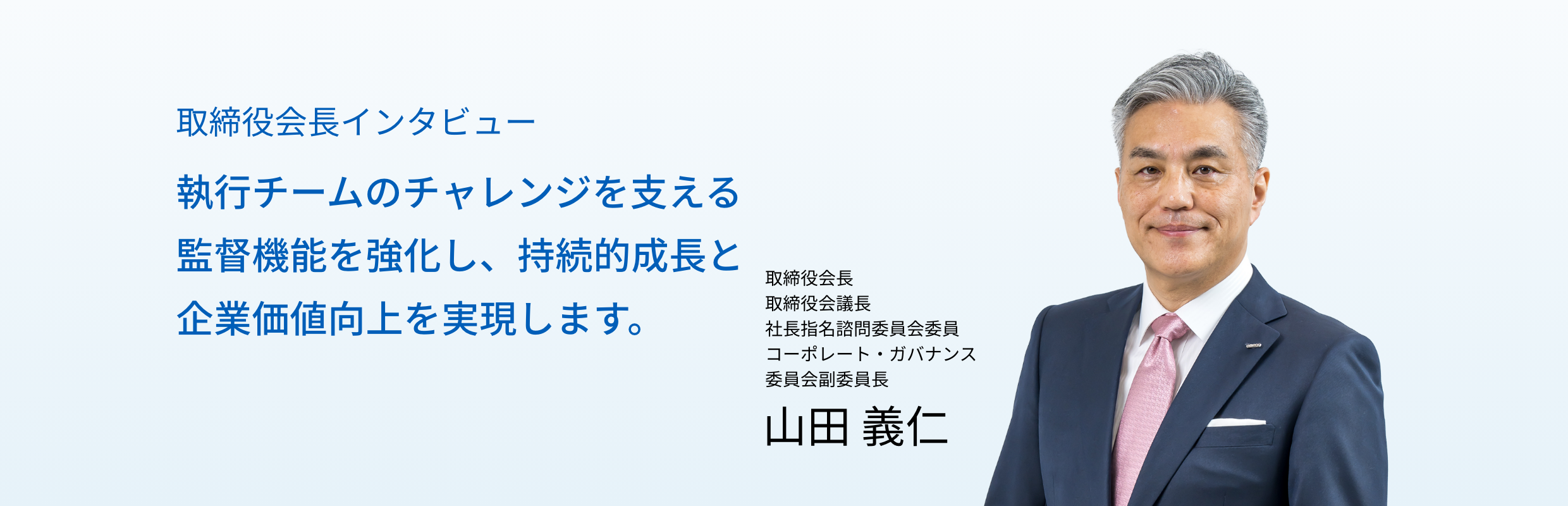 取締役会議長として、豊富な経験を持つ社内外の取締役と共に、多様な視点でガバナンスを進化させていきます。そして、監督機能をさらに進化させることで、執行側への権限移譲を加速し、ハイサイクルな事業運営を後押ししていきます。私はこれまで、企業理念を求心力の原点と発展の原動力にする経営をしてきました。会長としてもこの活動を続けることで、執行チームを見守り応援していきます。また、取締役会を健全かつ建設的な議論ができる場にしていきます。そして、執行と共に持続的な企業価値向上に取り組んでまいります。