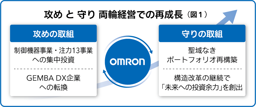 SF 2nd Stage では、SF2030の社会的課題は変えず、この5年間は、「攻め」と「守り」の両輪で、オムロンを再び成長軌道に乗せることを目指します。(図1 ご参照)そのために、実行力を徹底的に強化し、結果を出し続ける組織をつくるために4つのことにこだわります。まず、「執行ガバナンスの強化」です。CEO主導で執行の経営ガバナンスを強化し、注力事業や重点施策に対し、現場と一体となって成果を追い求めます。次に、「スピード経営の実現」です。市場の環境変化に対応するために、スピード経営を実行します。権限委譲を大幅に行い、事業や現場の自律化を促します。また、業務のプロセスDX化を進めていきます。次に、「人財強化」です。実行力の源泉は人財です。評価、処遇制度を見直し、成果主義への転換を図ります。また、経営人財100名を育成していきます。最後に、「企業文化のアップグレード」です。今一度、原点に戻り凡事徹底を実践します。さらに、創業者の精神であるベンチャー精神と組み合わせた、新たな企業文化を創ります。