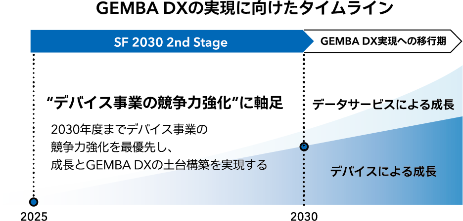 SF 2nd Stage の方針は「Trusted Growth」です。GEMBA DX企業への転換に向け、顧客との信頼関係をさらに深め、再度力強い成長を実現するという強い意志を込めました。オムロンは、これまで製品やデバイスを通じて顧客課題を解決することで、成長してきました。次の5年間は、この原点に立ち返り、オムロンの競争力の基盤であり、収益性の高いデバイスを徹底的に磨き上げる期間と位置づけます。そして、デバイスを強化することで、2030年度に向けてデータサービスを中心とした新たな成長モデルへと段階的に移行していきます。SF 2nd Stageの5年間はデバイスを成長の原動力とし、デバイスの拡販を通じて競争力を再び磨き上げる期間と位置づけ、GEMBA DXの実現に向けた確度を高めていきます。