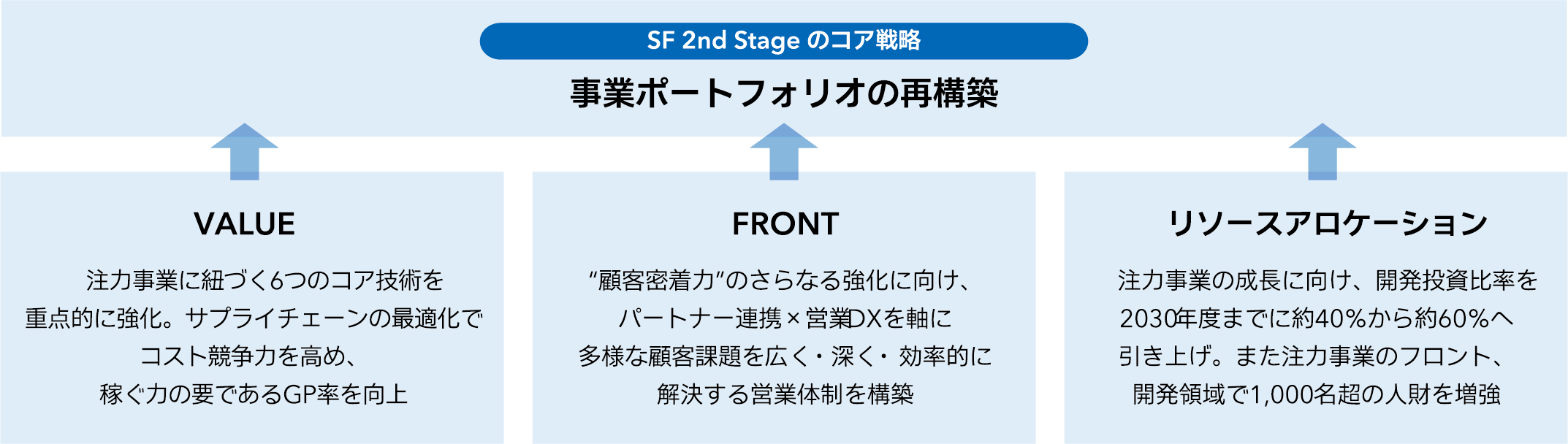 SF 2nd Stage では、「事業ポートフォリオの再構築」をコア戦略に位置づけています。選択と集中を一層加速し、グループ全体の成長を最大化する“尖り”のある事業ポートフォリオをつくり上げていきます。その実現に向けてグループの成長を牽引する13の注力事業を、「収益性」、「市場成長性」、「データサービス事業との親和性」の観点から特定しました。これらの事業の成長を最大限に引き出すために、「VALUE」、「FRONT」、「リソースアロケーション」の3つの領域で変革を力強く進めていきます。