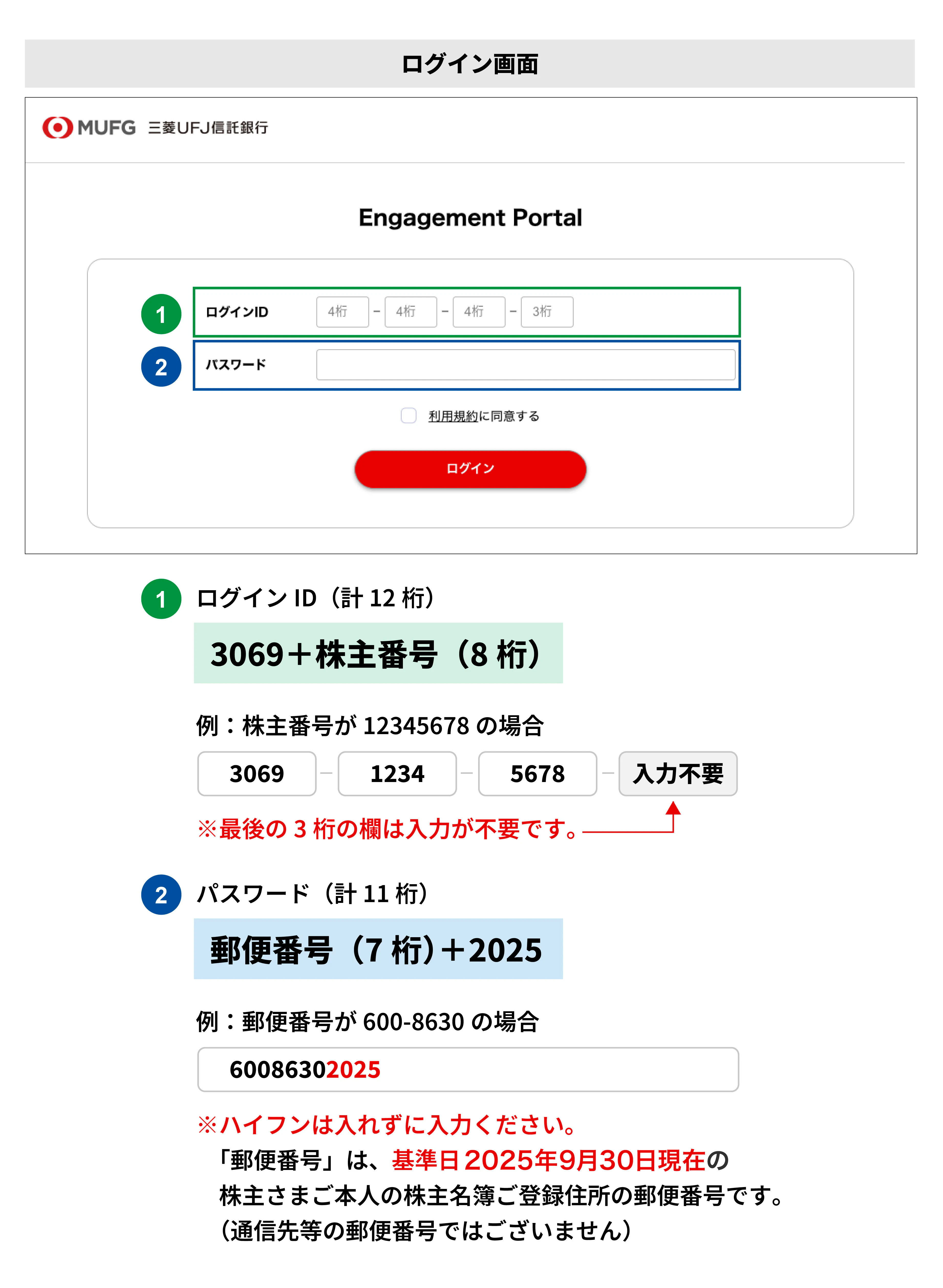 STEP3 株主さま認証画面(ログイン画面)で①ログインIDと②パスワードを入力してください。(下記イメージ参照)