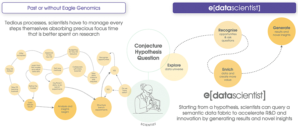 このような課題に対し、Eagle社は世界初※1となる迅速に多変量開発を実現するソフトウェア「e[datascientist](読み方:イーデータサイエンティスト)」を開発し、長年の実用化に向けてのボトルネックを解消しました。「e[datascientist]」は、多変量分析が可能な為、顧客の開発のスピードを最大で10倍加速することができます。また、顧客の仮説構築・検証のサポートも行うことができます。